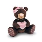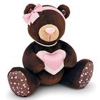 Стильная плюшевая медведица с декоративными элементами очарует своей мягкостью и детей, и взрослых! Высота игрушки 70 см. У зверюшки нежная бархатистая шёрстка, атласные вставочки на лапах и ушах, гладкий носик и блестящие глазки-плошки. В руках мишутка держит розовое сердце с пришивной аппликацией, которое придаёт ему элементы романтики. Завершает его образ атласная лента, аккуратно завязанная бантиком на голове медведя-девочки.