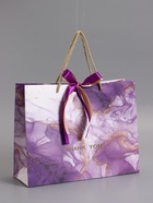 Розовый мрамор с белыми прожилками. Ламинированный подарочный пакет «Мрамор», розовый с белым — это упаковка формата L (32×25×11 см) с рисунком под натуральный камень, элегантной надписью и прикреплённым шнуровым бантом. Плотность картона 190 г/м², ламинация защищает от влаги.