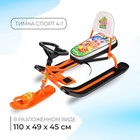 Снегокат предназначен для перевозки детей по плотному снегу или льду, катанию с горок. Имеет сварную конструкцию из стальных труб и пластиковых элементов. Оснащён мягким сиденьем, обтянутым искусственной кожей с рисунком, складной спинкой и двухточечным ремнём безопасности. Оборудован буксировочным тросом с автоматической намоткой и системой амортизации, которая обеспечивает комфортную поездку по крутым горкам и неровным поверхностям. Усиленный тормоз эффективен на обледенелой поверхности.