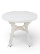 - Пластик для улицы: материал выдерживает осадки, перепады температур и воздействие ультрафиолета. Стол не разбухает от дождя, не трескается на солнце и сохраняет изначальные свойства без дополнительной защиты.