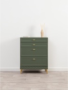 Глубокая фрезеровка фасадов из МДФ придаёт мебели утончённый внешний вид, а благородный оттенок «Олива шагрень» с насыщенным зелёным тоном создаёт атмосферу уюта и респектабельности. Металлические ручки и опоры золотого цвета добавляют изысканный акцент и подчёркивают премиальный характер изделия.