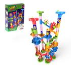 Набор состоит из прозрачных трубочек, разноцветных мостиков, извилистых дорожек и мельниц. Малыш без труда соорудит трассу любой длины и сложности и будет следить за перемещениями шариков.