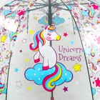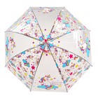 Детский тростевой зонт с полуавтоматическим механизмом и прозрачным куполом из ПВХ украшен яркими разноцветными изображениями из детской тематики и животного мира. Диаметр 88 см создаёт комфортное пространство под зонтом, а 8 металлических спиц обеспечивают устойчивость и прочность. Компактная длина и удобный дизайн подходят для девочек, сочетая практичность и привлекательность.