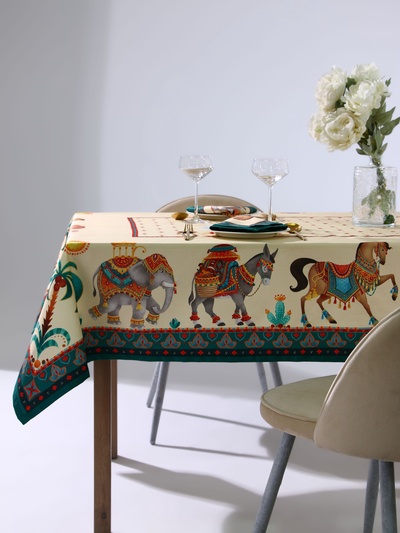 изюмительно:) яркий принт, качественная ткань, выглядит очень празднично, особенно если подобрать посуду под цвет