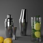 Шейкер изготовлен из качественной нержавеющей стали, состоит из стакана для смешивания, сита для льда и крышки — мерного стакана.