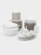 Столовый сервиз на 12 персон объединяет 48 предметов из белого фарфора с деликатным рельефом. Полный набор посуды рассчитан на сервировку завтраков, обедов и ужинов для большой семьи или приёма гостей. Единый дизайн всех предметов создаёт аккуратную и цельную картину на столе.