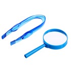 Размер лупы: 12,5 × 6,5 × 1,4 см; пинцета: 14 × 5 × 2 см.