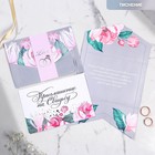 Когда дата и время бракосочетания уже известны, и вы определились со списком гостей, необходимо оповестить их о предстоящем празднике. Существует традиция делать персональные приглашения с указанием времени и даты мероприятия. Но перед свадьбой столько всего надо успеть, что на изготовление десятков открыток просто не остаётся времени. В этом случае вам придёт на помощь уникальное приглашение. Изделие выполнено из бумаги плотностью 120 грамм и дополнено тиснением. Это придаёт дорогой и роскошный вид. Текст приглашения содержит свободные поля для имени адресата, времени, даты и адреса проведения мероприятия. Это потрясающее приглашение достойно стать частью такого важного события в жизни, как свадьба!