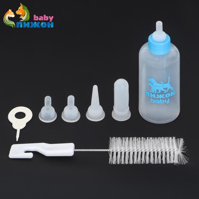 Набор для вскармливания щенков, котят и грызунов ПИЖОН. В комплекте содержится: 1 бутылочка объемом 60 мл, 4 соски, 2 короткие длиной 2 см, 1 длиная с тонким носиком 3 см, 1 длиная с толстым носиком 4 см, 1 ершик-щётка для мытья бутылочки. Показания к применению: для искусственного вскармливания новорожденных и подрастающих щенков, котят и других животных, а также для кормления больных и выздоравливающих животных. Способ применения: кончик резиновой соски проткните иглой или отрежьте верхушку ножницами. Будьте осторожны, потому что из-за слишком большого отверстия в соске животное может подавиться. После каждого использования, тщательно помойте бутылочку и соску.