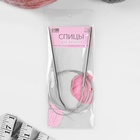 Круговые спицы представляют собой две металлические части, соединённые друг с другом тросиком. Инструмент незаменим при вязании полотна по кругу. С его помощью получаются изделия без дополнительных швов: шапки, рукава и горловины.