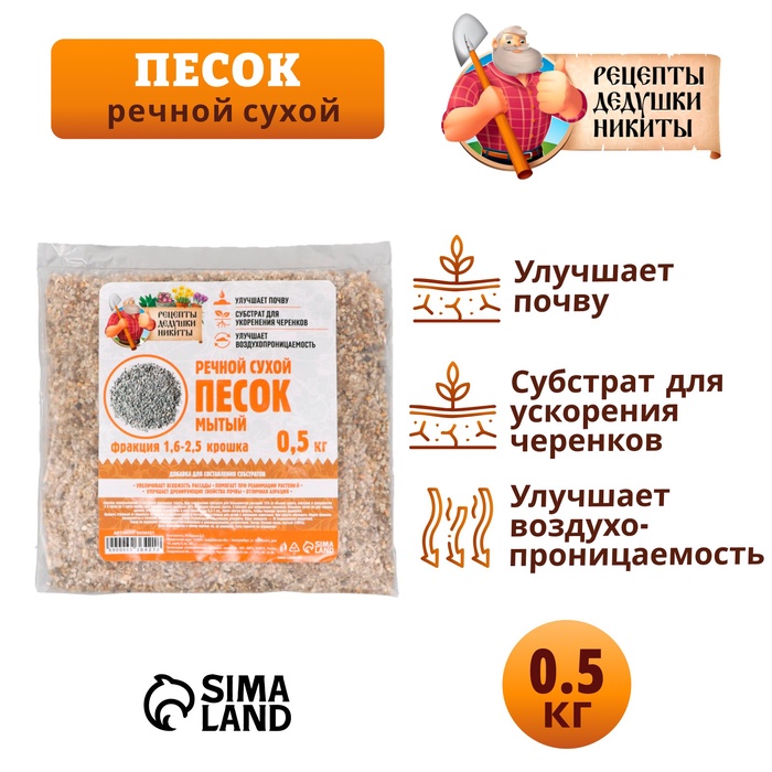 Речной песок «Рецепты дедушки Никиты», сухой, фр 1.6-2.5, крошка, 0.5 кг