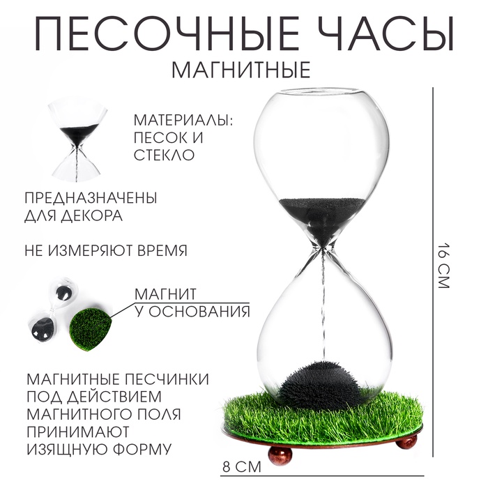 Необычные песочные часы – лучший способ декорировать интерьер комнаты или офиса. Изготовленные из стекла, металла и декоративного магнитного песка, эти часы подойдут под любой интерьер. Отличный подарок любимой женщине, коллеге, маме и бабушке. Глядя на движение чёрных песчинок вы постепенно будете чувствовать как проходит ваша тревога и стресс. Стилизованные песочные часы состоят из двух сосудов, соединённых узкой горловиной, один из которых частично заполнен песком.