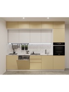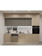Cовременное решение с продуманной архитектурой и акцентом на функциональность. Прямая компоновка и трёхуровневая конструкция до потолка формируют цельное, организованное пространство, где каждая зона логично встроена в общую систему хранения и приготовления пищи.