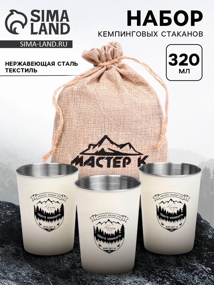 Набор стаканов из 3 штук по 320 мл из пищевой нержавеющей стали с удобным и компактным холщевым мешочком с завязками для хранения и переноски. Отлично подходит для любителей охоты, рыбалки и людей любящих вылазки на природу, в горы, путешествия. Легкие и компактные, удобно брать с собой на отдых.