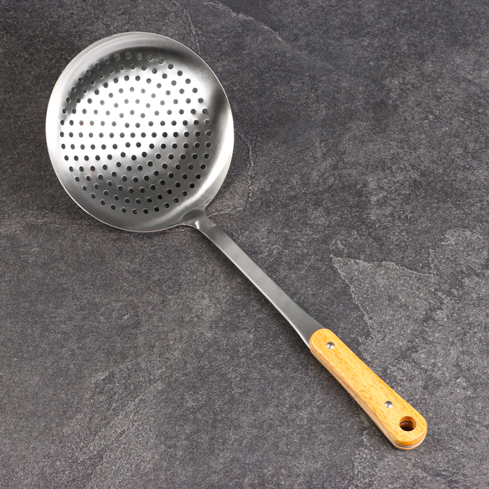 Шумовка с деревянной ручкой совмещает в себе удобство использования и долговечность. Такой аксессуар станет верным помощником при приготовлении любимых блюд.