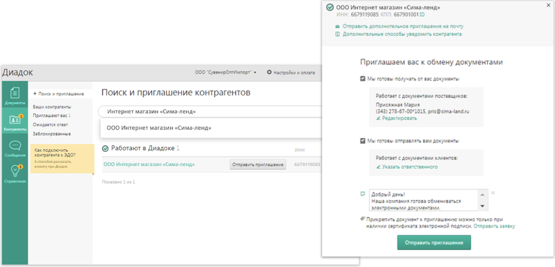Перейдите в личный кабинет «Диадока» и отправьте организации ООО «Интернет магазин «Сима-ленд» предложение о переходе на ЭДО.