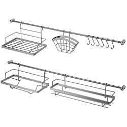 Если кухня у вас небольшая и хочется сэкономить место, используйте рейлинговую систему. Благодаря ей не придётся занимать пространство в шкафах или на столешнице — всё необходимое будет на стене. Конструкция проста: она включает перекладину, а также крючки и навесы для кухонных принадлежностей.