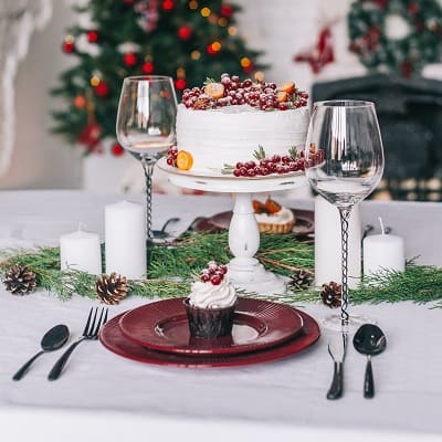Красные тарелки и блюда можно дополнить классическими бокалами на высокой ножке. А в центре стола поставьте тортницу или многоярусное блюдо с вашим фирменным бисквитом или любимыми пирожными.
