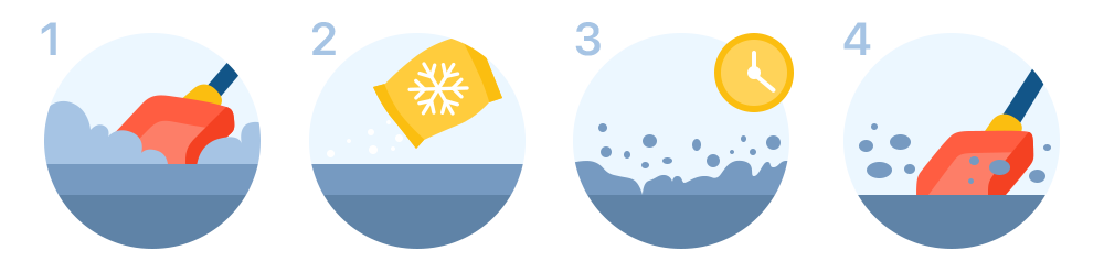 Обработайте материалом тротуары, площади, дворы, автомобильные дороги, лестничные сходы и пандусы. Реагент разрушит лёд и длительное время будет препятствовать образованию снежного наката.