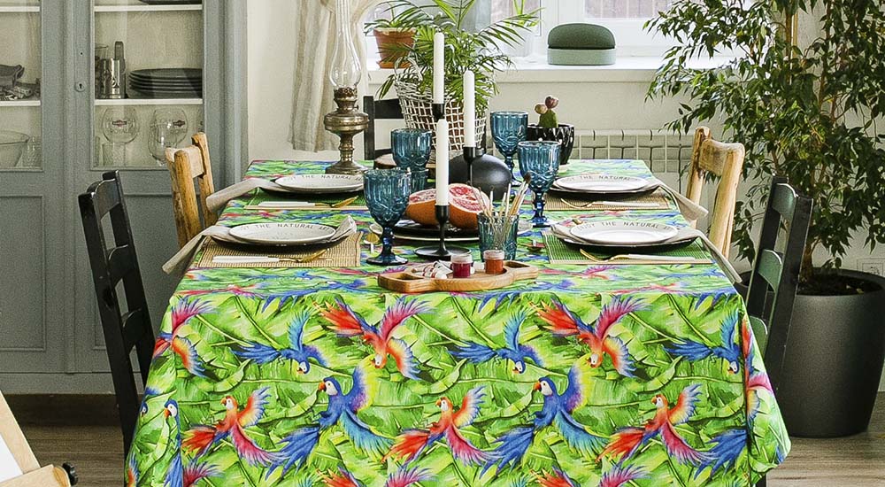Яркая скатерть, полотенца и сидушки на стул станут красочными акцентами на кухне. Поставьте на стол фактурную посуду из цветного стекла и встречайте гостей! Такой текстиль можно использовать на повседневных обедах, детских днях рождения или семейных встречах.