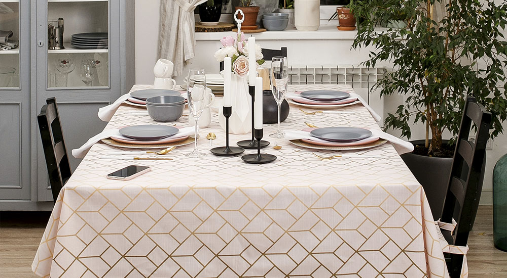 Трендом 2019 года стали геометрические узоры. Молочный, пудровый или золотистый оттенки в сочетании со сложным рисунком придадут утончённости праздничному столу. Такой текстиль подойдёт для торжественных случаев: юбилеев, корпоративов, долгожданных встреч с родственниками.