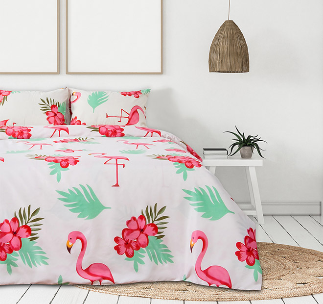 Тропический стиль — самый актуальный в интерьерной моде. И чтобы вам не пришлось покупать новые обои и менять мебель, мы предлагаем оформить спальню с помощью текстиля. Достаточно будет сочетания трёх цветов: зелёного, белого и розового.