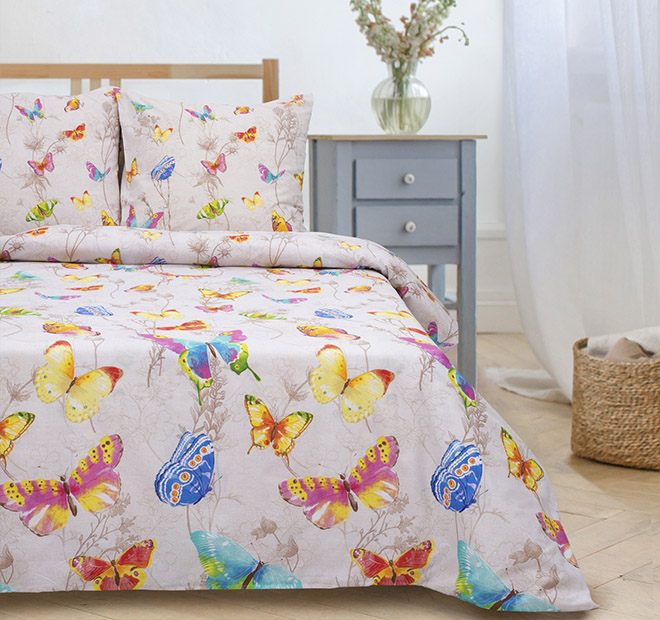 Бабочки — это символ яркого солнца и чистого неба. Поэтому подбираем постельное бельё, шторы и декоративный текстиль в голубом, жёлтом и оранжевом цветах. Чтобы не получилось слишком пёстро, изображения самих бабочек достаточно будет на одном из изделий.