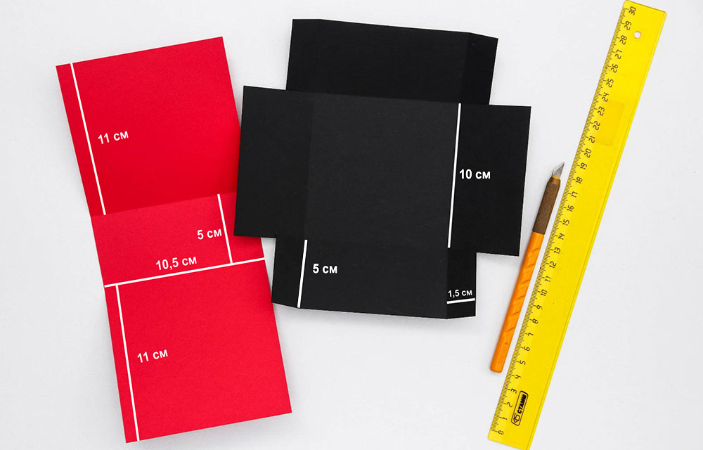 ④ Из бумаги с мишкой вырежьте кармашек и приклейте его к оборотной стороне крышки.