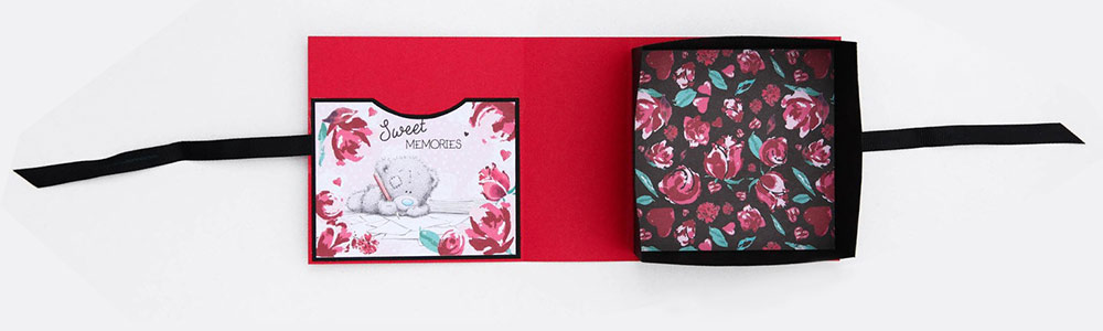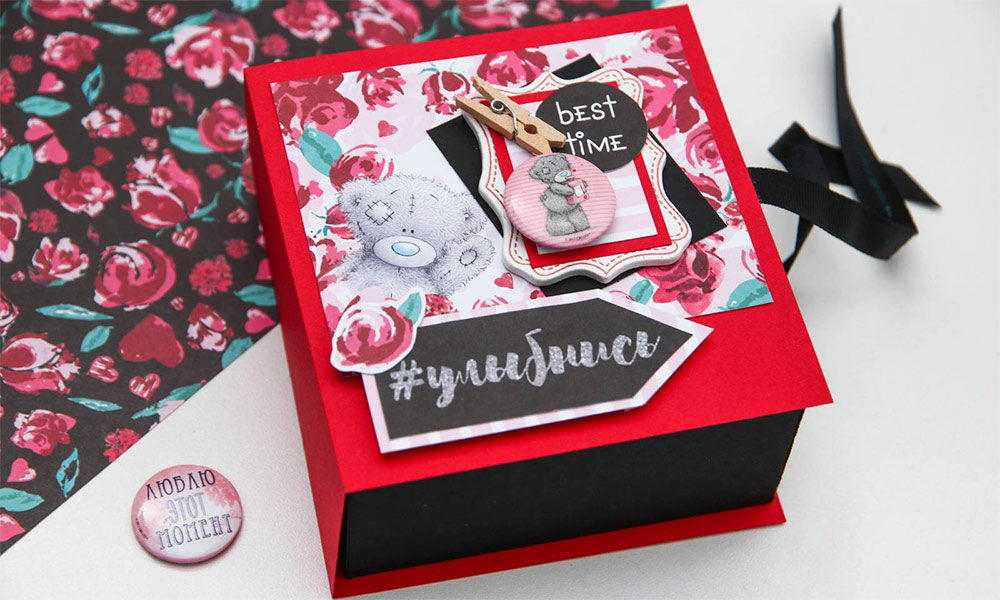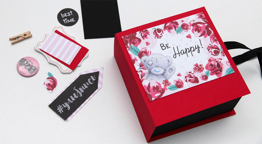 В статье покажем, как из картона и декора для скрапбукинга сделать очаровательную шкатулку с мишкой Тедди. В такой можно хранить дорогие сердцу мелочи или преподнести подарок. Смастерить её проще простого, главное — подобрать материалы. Мы использовали лицензионную бумагу и декор Me to You.