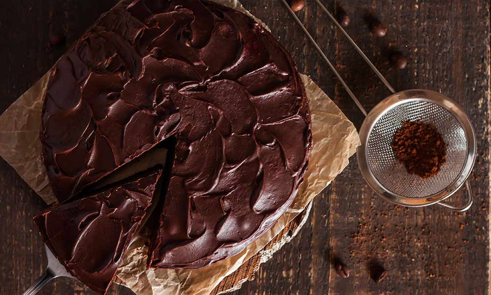 Заливаем бисквит. Вылейте ганаш на основу из теста и слегка потрясите форму, чтобы масса растеклась равномерно. Ложкой сделайте на поверхности узоры или разровняйте её. Дайте заливке застыть: поставьте торт в холодильник (на полку, которая дальше всего от морозилки). Когда ганаш затвердеет, удалите бумагу для выпечки и подавайте десерт.
