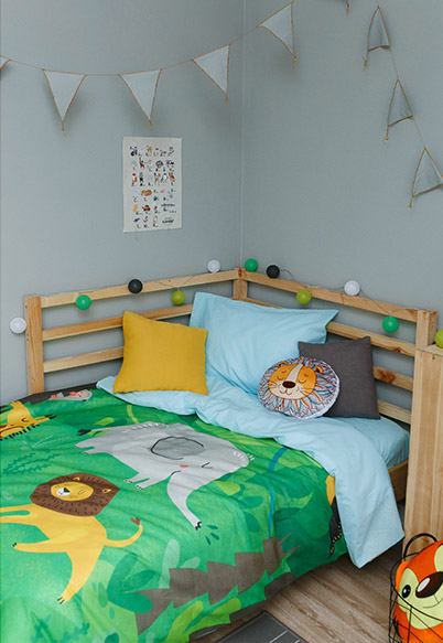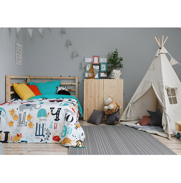 Оно задаёт настроение всему интерьеру, поэтому начнём именно с него. Принты с джунглями, милым тигрёнком, забавным алфавитом или целой историей принцессы — ребёнок будет в восторге! Осталось лишь выбрать, что по душе хозяину комнаты.