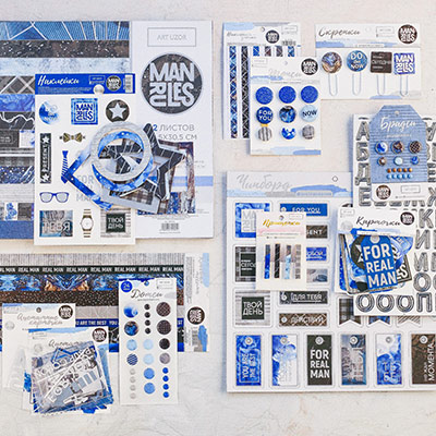 Это коллекция для брутального альбома (мужчинам нравятся подарки хенд-мейд, проверено на личном опыте). Элементы выполнены в строгой расцветке — синих, голубых и чёрных оттенках. Но несмотря на холодную палитру, получатель будет растроган. |
