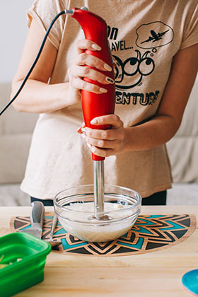 Достаньте фрукты из морозилки, дайте немного отойти и взбейте блендером. |