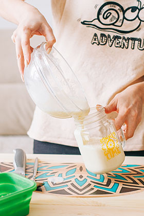 Разлейте смесь по стаканам, добавьте сок, молоко и лёд. |