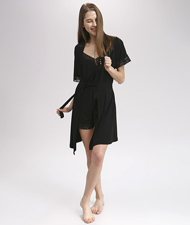 Домашняя одежда из вискозы приятна к телу. Материал лёгкий и хорошо тянется, поэтому очень красиво облегает фигуру. В коллекции гармонично сочетаются однотонные ткани и нежное кружево, тем самым делая домашний образ романтичнее.