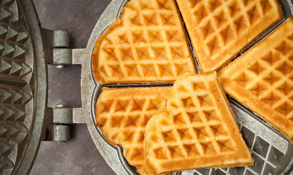 - Равномерно выливайте тесто на разогретую вафельницу и жарьте вафли до золотистой корочки.