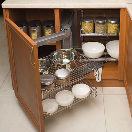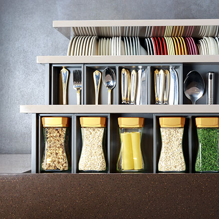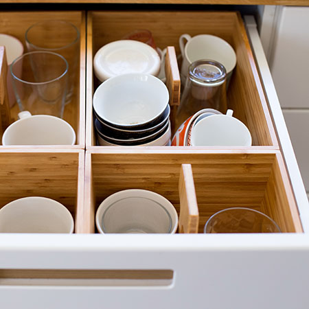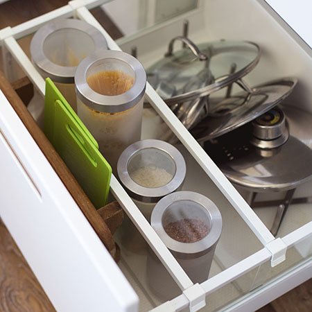 Хорошо, когда шкафов много и есть где разложить всю кухонную утварь. Но если такой возможности нет и место для хранения ограничено, отсортируйте посуду и приборы и отведите им своё место в ящиках. Крышки удобно держать отдельно от кастрюль,