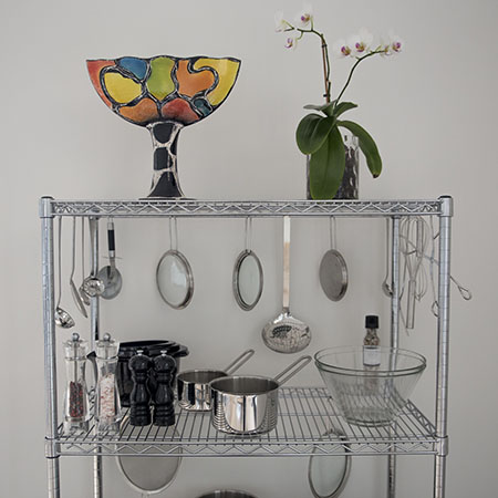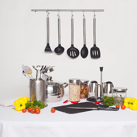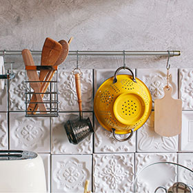 Чтобы держать всё необходимое под рукой, понадобится рейлинг, крючки, подставки под инструменты, ёмкости для специй и различные держатели. Точный список зависит от того, чем пользуетесь конкретно вы.