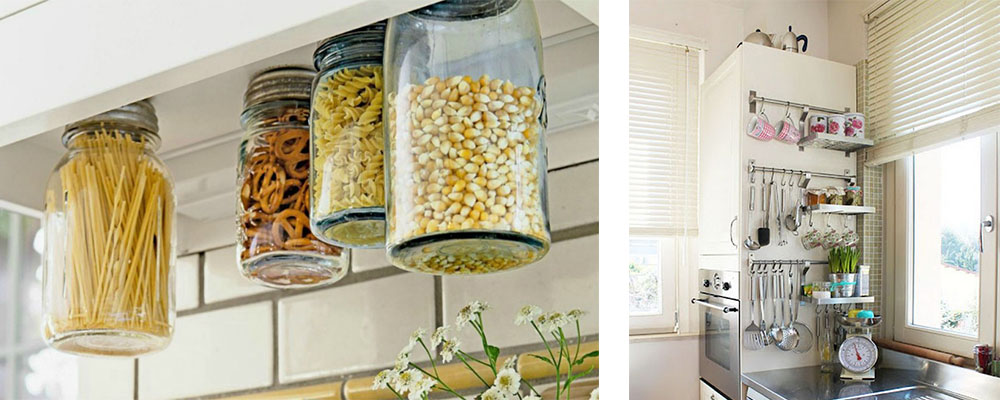 - Используйте пространство между верхними шкафчиками и столешницей. Кто-то устанавливает там дополнительные полочки, а кто-то саморезами крепит крышки к нижней части навесных шкафов и вкручивает туда банки с провизией. Выглядит интересно.