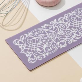 Чтобы получить из мастики ажурную ленту, понадобится коврик для айсинга и шпатель. Выложите белую мастику на коврик, выровняйте шпателем и оставьте на 1–2 часа подсохнуть. Затем выньте декор, потянув за край коврика. Прикрепите мастику на боковинку торта.