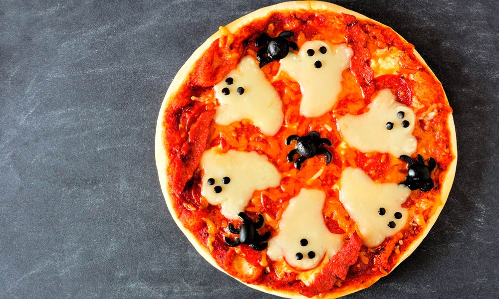 - Сделайте из маслин паучков, как на фото, и выложите на пиццу. Также из маслин можно вырезать глазки и рты для привидений.