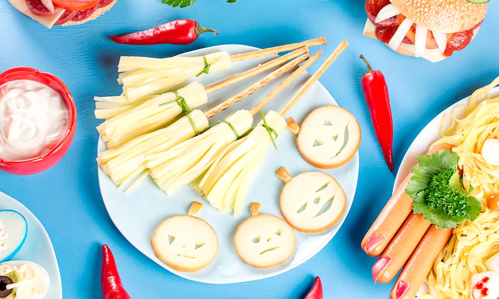 - Нарежьте сыр и вырежьте острым кончиком ножа привидений.