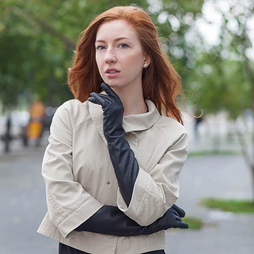 Такие модели надевайте в пару к пальто и курткам с укороченными рукавами и модным сейчас кейпам и пончо. Так как длинные перчатки на виду, они становятся главным акцентом образа. Чтобы создать гармоничный look, повторите цвет или декор аксессуара в одежде.
