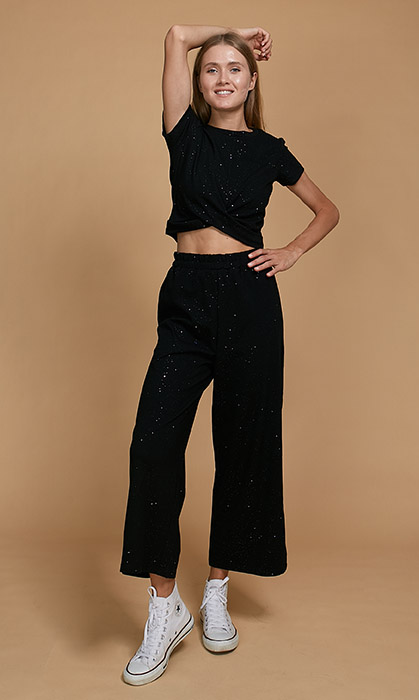 Сочетание элегантной классики брюк и безбашенности укороченного топа выглядит довольно непринуждённо. А главное, подходит для любого события. Даже для официального приёма, если правильно подобрать аксессуары и поработать над причёской. Например, надеть серьги с натуральными камнями и собрать локоны в высокий пучок.