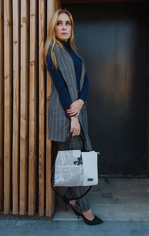 Если вам кажется, что однотонная сумка — слишком скучно даже для деловых встреч, присмотритесь к моделям с газетным принтом. Они выглядят строго и в то же время свежо.