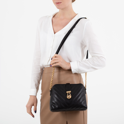 Благодаря тому, что у этой модели 2 отделения, она более вместительная, чем предыдущая. У нас в неё вошёл объёмный кошелёк на фермуаре и даже яблоко среднего размера!