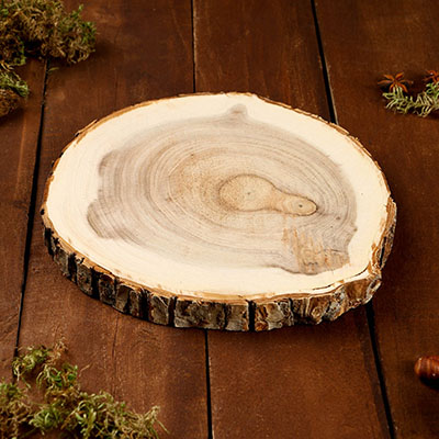 Под тарелки можно подложить спилы дерева. Они являются побочным продуктом деревообработки, поэтому гуманнее будет использовать их в качестве декора помещения, а не выкидывать на свалку.
