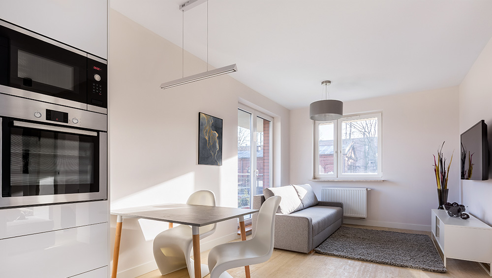 В монохромном стиле важно, чтобы все элементы были в одной цветовой гамме. Так комната будет зрительно выглядеть больше, особенно если вы оформите её в белом цвете. Чтобы избежать эффекта стерильности интерьера, добавьте немного ярких мелочей. Это может быть скатерть с позолотой или посуда в чёрном цвете.