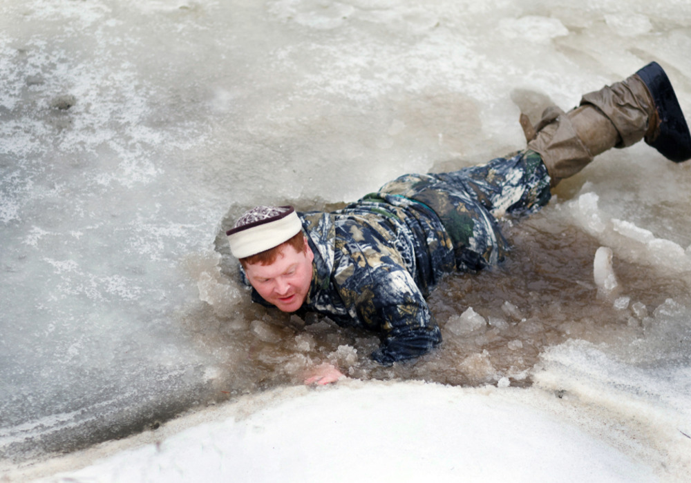 - Раскиньте руки в стороны и постарайтесь зацепиться за кромку льда. Плавно тянитесь к ней грудью. Затем медленно, без резких движений забросьте сначала одну ногу на лёд, потом другую. Не вставайте сразу, ползком доберитесь до безопасного места.
