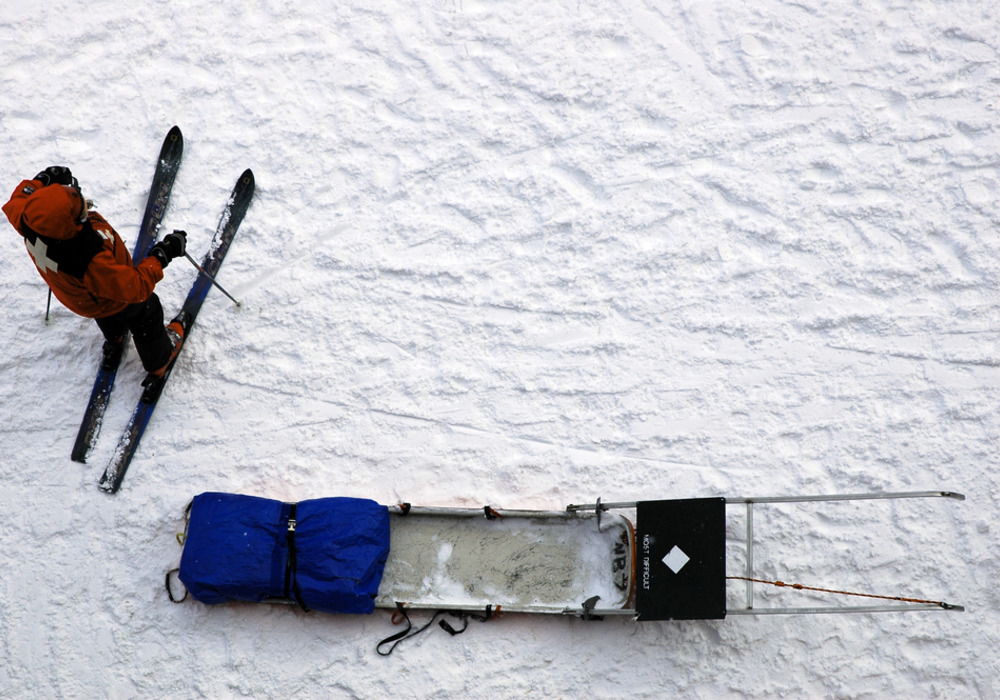 - Если выбраться не получается или человек не умеет плавать, вытяните его на поверхность с помощью длинной вещи — шарфа, ветки или даже санок. Если вещей нет, лягте и протяните утопающему руку. Если вас несколько человек, лягте и сформируйте живую цепь. Никогда не стойте у кромки льда.